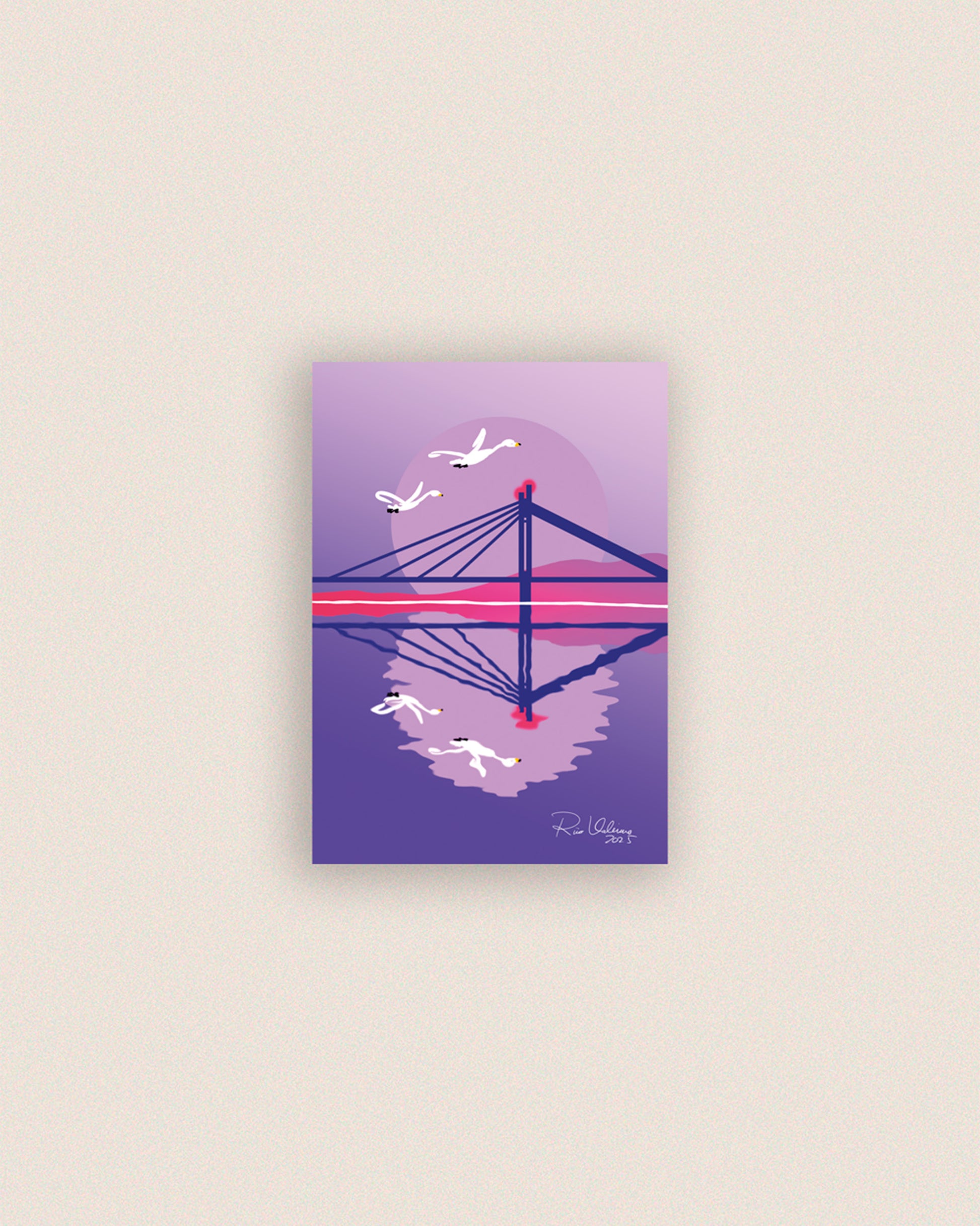 Tämä kotiseuturakkautta henkivä Rovaniemi-aiheinen postikortti muistuttaa kesän ja yöttömien öiden saapumisesta Rovaniemelle. Kesä saapuu Rovaniemelle on saatavana tämän lilan ja sinisen sävyisen (II) posrtikortin lisäksi myös kirkkaan oranssin ja pinkin sävyisenä (I), sekä taideprinttinä A4 ja A5 koossa.